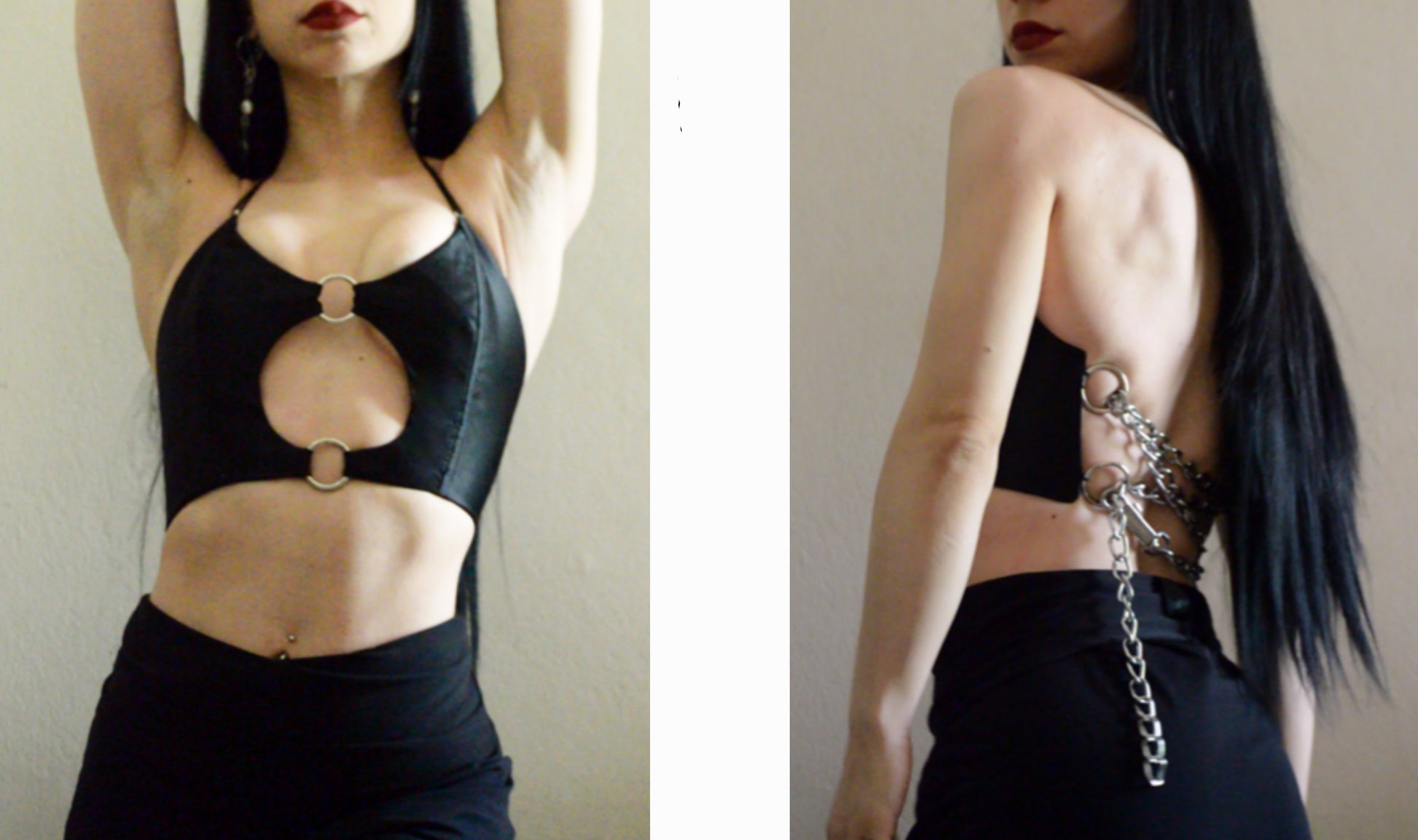 This corset top is made from satin fabric and features chain detailing. The top can be tied with silk ribbons for a softer look and can be custom made to fit any size. It provided security with boning.